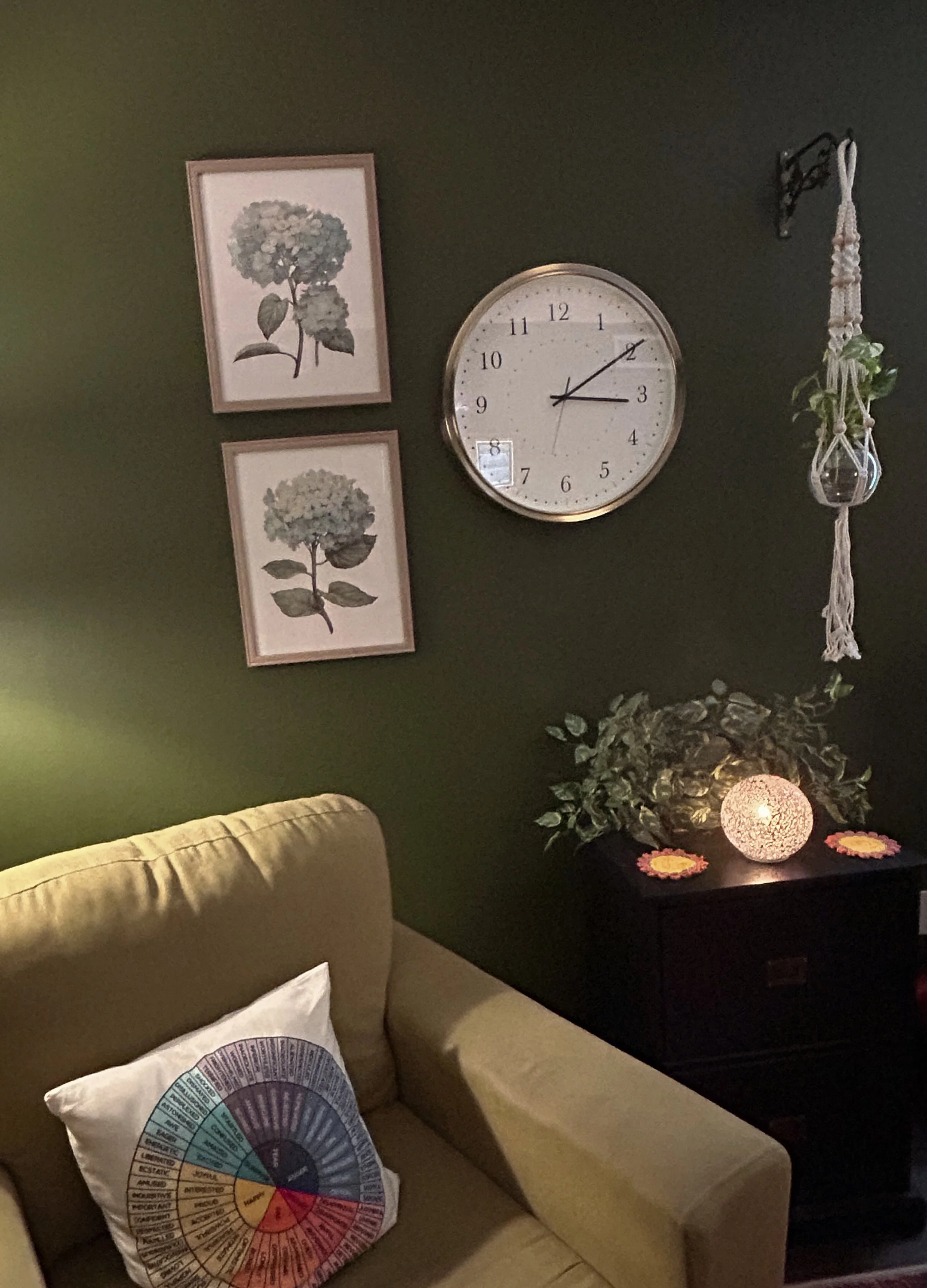 My hope is to offer an environment that feels grounding and restorative. Snacks, fidgets, and toys are available to clients during the session. Above all, I hope this is a space where you can settle in, feel at ease, and experience a sense of safety and belonging.